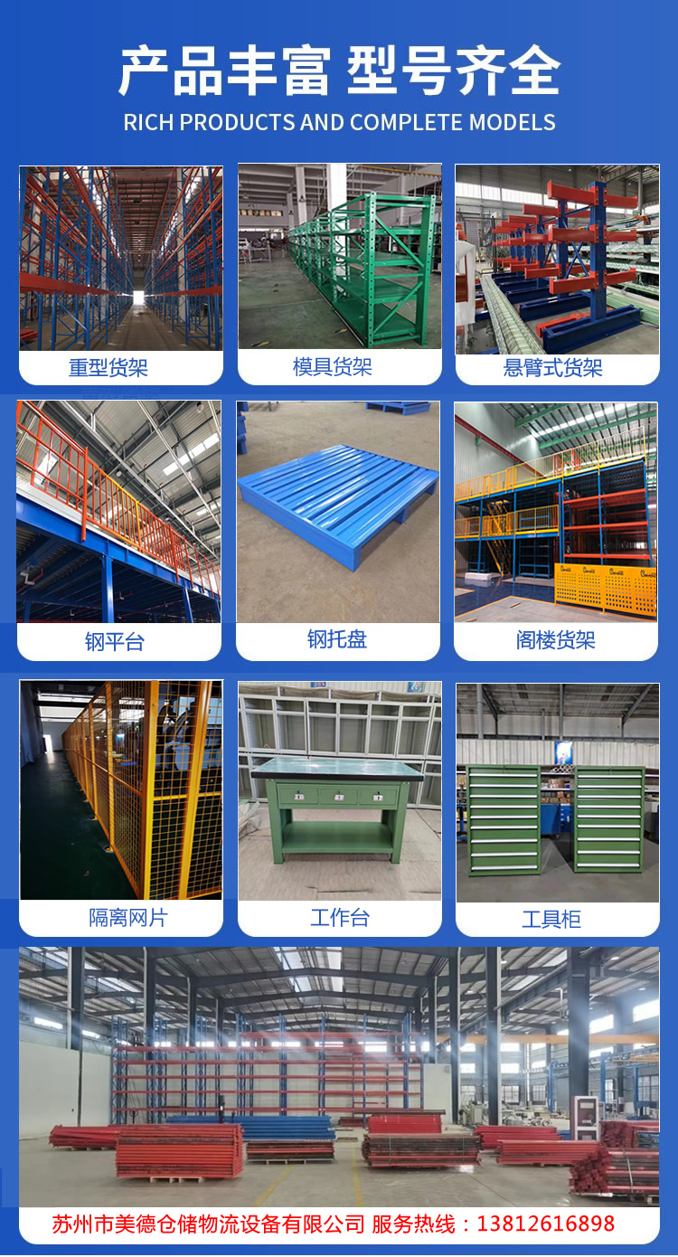 苏州市美德仓储物流设备有限公司是从事仓储货架设计制造、销售、安装服务一体化的货架及其自动化周边配套设备的制作型公司,仓库货架,重型货架,中型货架,阁楼货架,模具架,工作台,轻型货架, 钢平台,流利货架,钢托盘,隔离网 - 公司多年来致力于为各个行业广大客户的工厂、仓库及物流中心提供存储系统的解决方案和细致周到的全程服务。